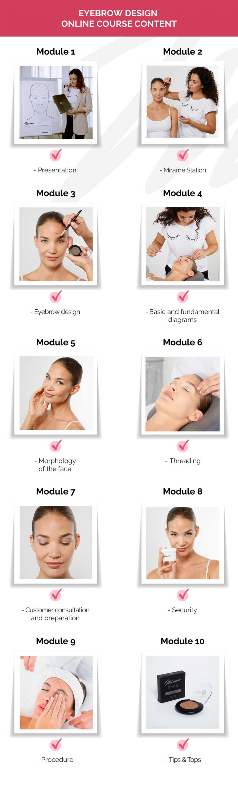 ONLINE COURSE WITHOUT KIT: After making the reservation you will receive an email with access to the course. You will also have access to your MÃrame’s advisor to solve all your queries in the Eyebrow Design Online Course. *The first classes are theoretical, but from step by step you will need the following material to practice: Brow thread, semi-permanent eyebrow shadows, eyebrow stencils and brush.