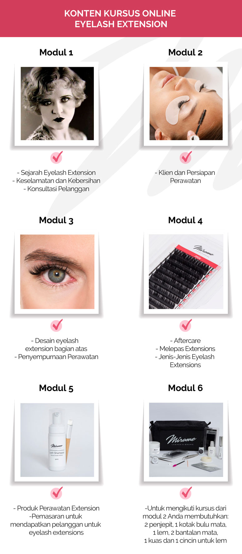 KURSUS ONLINE TANPA KIT: Setelah melakukan reservasi, Anda akan menerima email. Dalam maksimal 24 jam Anda akan dihubungi oleh penasihat Mírame Anda dapat mengambil 14 kelas Kursus Online Extensions Bulu Mata. *Kelas pertama bersifat teoritis, tetapi dari modul 2 Anda akan membutuhkan materi berikut untuk berlatih: 1 klip melengkung dan lurus, 1 kotak bulu mata, 1 perekat hipoalergenik khusus untuk bulu mata extensions, 1 tambalan ganda, 1 kuas dan 1 cincin untuk perekat.