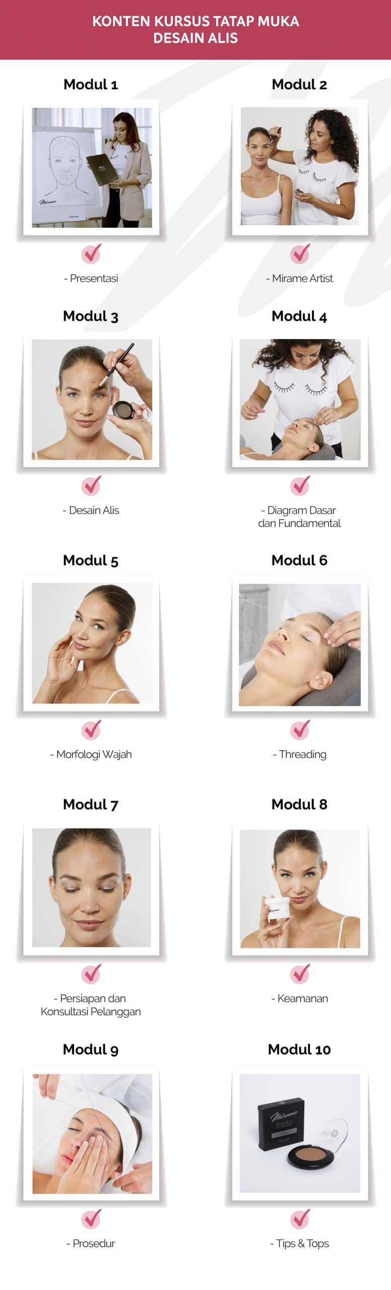 Selama kursus, pengetahuan dan teknik yang diperlukan untuk menjadi gelar master dalam desain alis diperoleh dan dipraktikkan dengan model nyata (disediakan oleh siswa *) dengan pedoman dan pengawasan berkelanjutan dari pelatih.
